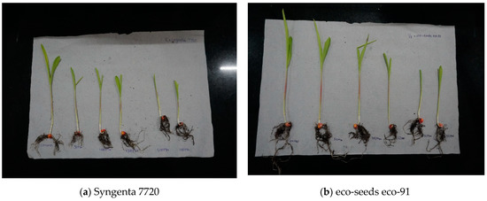 In this experiment, the effect of salinity on proline content in five maize varieties was determined (Table 1). We found that as the salt concentration decreased, the rate of germination and germination percentage increased, and also, as the concentration level increased, the proline contained in maize also increased. Among the five evaluated varieties, two varieties, i.e., Syngenta 7720 and eco-91 (Figure 1a,b), had higher yields, mostly due to their increased level of proline concentration.