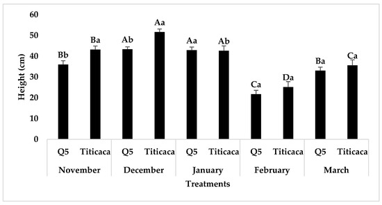 Final plant height of quinoa crop. For each cultivar, means followed by the same capital letters are not significantly different at p ≤ 0.05. For each sowing date, means followed by the same small letters are not significantly different at p ≤ 0.05.