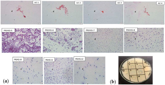 (a) Microscopic images of Gram-stained bacterial isolates (1st row (left to right)—Ashby isolates, AZ-1, 2, 3, 4 with negative Gram character. Second and third row—PGPR isolates, PR(HS)-5, 6, 7, 7, 10, 11 and 12 with positive Gram character). (b) Phosphate solubilization test for isolates PR(HS)-1, 2, 3, 4, 5, 6, 7, 8, 10,11 and 12. Clear halo zones around the isolates PR(HS)-3, 4, 6, 8 and 10.