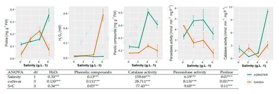 3.2. Effect of Salt Stress on the Antioxidants Enzymes, H2O2, Proline, and Phenolic Compounds