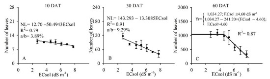 For the NL, linear reductions of 3.89 and 9.29% (dS m−1)−1 were observed at 10 and 30 DAT, respectively (Figure 1A,B). At 60 DAT, plants began to preserve their leaves up to ECsol of 4.60 dS m−1, with a mean number of 1034.27 leaves per plant and a linear decrease of 23.32% per unit increment of ECsol above the salinity threshold (Figure 1C).