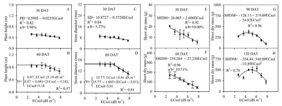 At 10 DAT, mean PH and stem diameter were, respectively, 0.195 m and 7.85 mm for all treatments, and only at 30 DAT were there significant differences due to ECsol, with a linear reduction of 3.98 and 5.27% (dS m−1)−1, respectively (Figure 2A,C). At 60 DAT, the variables PH and SD showed a plateau followed by a linear decrease, with salinity thresholds of 5.18 and 5.01 dS m−1, and a relative decrease of 9.31 and 11.9% per unit increase in ECsol above the threshold, respectively. The values of these variables up to the salinity threshold were 0.87 m and 15.77 mm, respectively (Figure 2B,D).