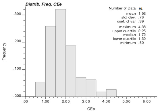 The data generally follows a normal distribution, with a few large values. The average value is 1.92 dS/m and values range between 0.8 and 4.38 dS/m, with a coefficient of variation of 39%.