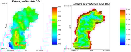 Soil salinity (ECe) was predicted by kriging (Figure 5 left) using a regular 30 m × 30 m grid. The predicted values are between 1 and 3 dS/m. Compared to the observed values, the predicted minimum value is higher (0.8 dS/m) and the predicted maximum value is lower (4.38 dS/m); this property is known as the kriging smoothing effect. The map reflects the spatial distribution of ECe in the same way as the observed values (Figure 5). However, there is a complete spatial coverage of the study area, whereas the observed sampling was limited to only 91 locations.