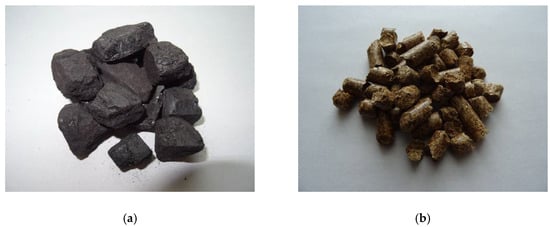In an automated boiler equipped with a retort burner and a solid fuel container, it is possible to burn both conventional fuel, such as crushed coal, and fuels from renewable energy sources in the form of biomass. Crushed coal is referred to as eco-pea coal [] (Figure 1a), while compressed biomass in the form of wood is called pellet [] (Figure 1b).