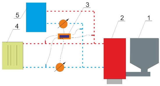 Schematic diagram of the measuring station for heat recording for the purposes of heating the building and producing domestic hot water: 1—fuel container with fuel feeder, 2—boiler, 3—heat recorder for heating the building and domestic hot water, 4—central heating installation, and 5—domestic hot water heater.