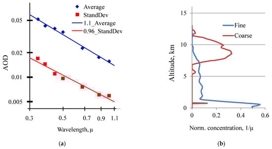 Figure 1b presents the average height profiles of the volume concentration of fine and coarse particles according to the terminology used in AERONET [2]. In this plot, the concentration profiles are normalized by the column amount, which is an integral of the concentration over height.