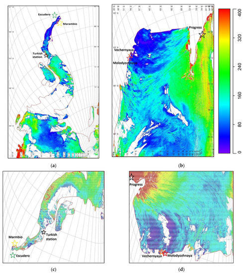 Maps of the effective grain size: (a) Antarctic Peninsula, Terra, 01/07/2022; (b) East Antarctica, Terra, 01/07/2022; (c) Antarctic Peninsula, Aqua, 01/08/2022; (d) East Antarctica, Aqua, 01/07/2022. The color scale is in micrometers.