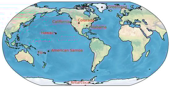 All the ozonesonde data used for this analysis were downloaded from NOAA ESRL’s ozonesondes website at https://gml.noaa.gov/ozwv/ozsondes/index.html (accessed on 9 June 2022). This archive includes data for 8 main weather stations that are distributed across the globe (but with the majority located in USA or its territories), that collectively cover the tropics, mid-latitudes and polar regions [12]—see Table 1. These locations are shown in Figure 1.
