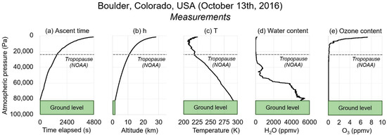 Relevant measurements from a typical ozonesonde plotted against atmospheric pressure—launched from Boulder, Colorado on 13 October 2016. (a) Time elapsed since the sonde was launched; (b) altitude; (c) temperature; (d) water content; (e) ozone content. NOAA’s estimate of the tropopause (as provided with each ozonesonde record) is indicated in each panel by a horizontal dashed gray line. As Boulder is a mountainous location, the ground level has a relatively low atmospheric pressure as indicated by the green boxes in panels (a,c–e).