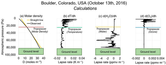 - Molar density. The molar density, D, at each point is calculated from the corresponding pressure and temperature measurements, following the approach described by Connolly et al. (2021) [13]. That is, D = P/RT, where R = the ideal gas constant. To calculate the tropopause using molar density, we use two derived metrics: the rate of change of D with altitude, dD/dh; the rate of change of D with pressure, dD/dP. We also study the deviation of the observed D values from a linear fit in the upper troposphere region. This region is defined as 35,000–50,000 Pa for Greenland and Antarctica; 30,000–50,000 Pa for Colorado, Alabama; 25,000–45,000 Pa for California; 15,000–35,000 Pa for Hawai’i; 15,000–40,000 Pa for American Samoa and Fiji. We define the molar density-based tropopause as the pressure above the boundary layer at which: