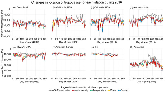 Changes in the location of the tropopause for the eight stations for the entire year of 2016, as calculated using each of the metrics described in the text: (a) Greenland; (b) California, USA; (c) Colorado, USA; (d) Alabama, USA; (e) Hawai’i,USA; (f) American Samoa; (g) Fiji; (h) Antarctica. The colors used for each estimate are the same ones used for the equivalent horizontal lines in Figure 2 and Figure 3.