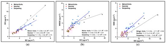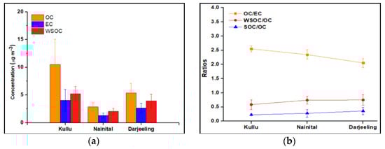 The findings that were acquired for the study sites are comparable to the previously reported PM10 aerosol mass and carbonaceous components at different sites in India (Table 1). In the present study, high concentrations of OC (Darjeeling: 5.36 ± 1.74 µg m−3; Nainital: 2.85 ± 0.75 µg m−3; Mohal-Kullu: 10.49 ± 4.56 µg m−3), EC (Darjeeling: 2.67 ± 0.87 µg m−3; Nainital: 1.30 ± 0.46 µg m−3; Mohal-Kullu: 4.06 ± 1.99 µg m−3), and WSOC (Darjeeling: 3.93 ± 1.17 µg m−3; Nainital: 2.04 ± 0.54 µg m−3; Mohal-Kullu: 5.23 ± 1.35 µg m−3) were observed (Figure 1a). The high concentrations of carbonaceous components might be due to the increased contribution from wood burning for household heating, open biomass burning, and the stable atmospheric conditions leading to pollution deposition within the lower atmosphere [,]. The observed OC and EC concentrations are in good accordance with other reported studies (Table 1). The SOC and POC were quantified in this study using the EC tracer method [].