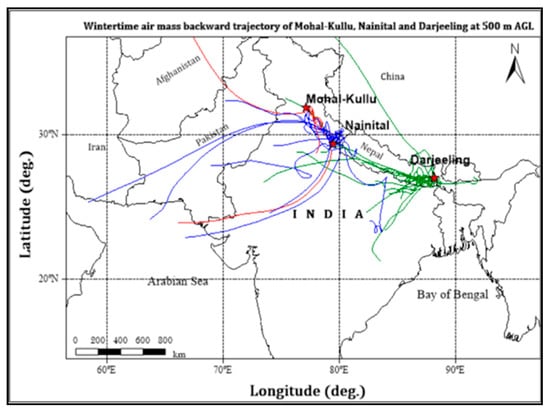 The diagnostic ratios of OC/EC and WSOC/OC are important for the identification of CA emission sources and secondary organic aerosol (SOA) formation and their removal rates and the aging of the atmospheric aerosols [,,,]. Figure 1b shows the OC with EC and the WSOC with OC ratios at Mohal-Kullu (2.6 ± 0.3, 0.6 ± 0.2), Nainital (2.3 ± 0.4, 0.7 ± 0.1), and Darjeeling (2.06 ± 0.37, 0.7 ± 0.2), respectively, which indicates the frequent practices of biomass burning during the season and the formation of SOC due to the transported carbonaceous species (Figure 2) from the nearby IGP region [,,,,,,,,,,,,,]. The acquired ratios of OC with EC and WSOC with OC are in good agreement with earlier reported studies [,,,,,,,,,,,].