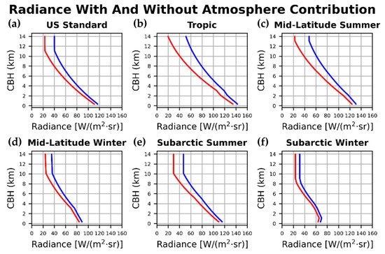 Cloud radiance registered by a typical FLIR infrared camera considering six standard atmospheric profiles: (a) US Standard (b) Tropic (c) Mid-Latitude Summer (d) Mid-Latitude Winter (e) Subarctic Summer (f) Subarctic Winter. The red line represents cloud radiance without atmospheric effect and the blue line represents cloud radiance considering the radiative effect of the atmospheric gases.