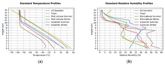 (a) Standard temperature profiles. (b) Standard relative humidity profiles.
