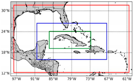 - Sierra, M.; Ferrer, M.; Hernández, R.; González, Y.; Borrajero, I.; y Rodríguez, R.F. Informe del Resultado No.1 del Proyecto: Sistema de Predicción a muy corto plazo basado en el Acoplamiento de Modelos de Alta Resolución y Asimilación de Datos. In 2014: Sistema Automático Depredicción a Mesoescala de Cuatro Ciclos Diarios; Instituto de Meteorologia de Cuba: La Habana, Cuba, 2014. [Google Scholar]