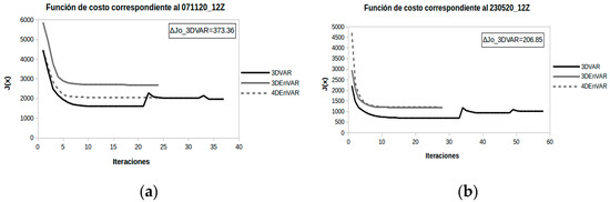Cost function reduction obtained by the different methods, (a) experiment initialized on 7 November 2020 at 12 UTC corresponding to tropical storm ETA; (b) experiment initialized on 23 May 2020 at 12 UTC corresponding to mesoscale convective system.