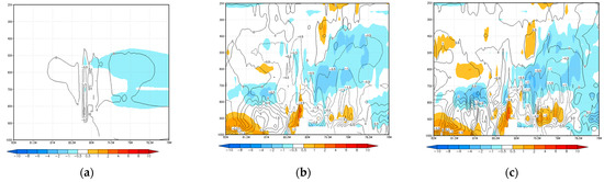 Cross-section showing the incremental analysis corresponding to 00:00 UTC initialization for mesoscale convective system case. Shaded represent the temperature increments and contour lines the specific humidity increments. (a) 3DVAR; (b) 3DEnVAR; (c) 4DEnVAR.