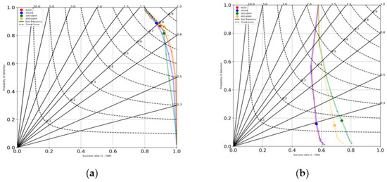 Performance evaluation of 24 h accumulated precipitation forecast derived from SisPI and the different assimilation schemes. (a) Eta’s case, (b) thunderstorm’s case, both initialized at 00:00 UTC.