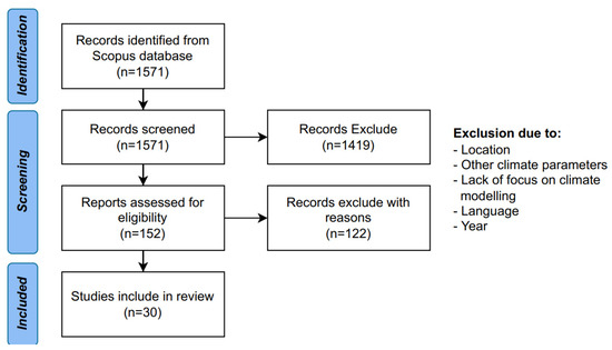 The authors used the preferred reporting items for systematic reviews and meta-analyses (PRISMA) approach to search and select the literature samples. PRISMA has 3 steps [1]: (1) identification, (2) screening, and (3) included. This study mainly focused on the stochastic climate model in Asian countries. After the screening process, we chose 30 articles representing 14 different journals, including the Journal of Hydrology (23%), the International Journal of Climatology (13%), and Theoretical and Applied Climatology (13%). The flow chart is shown in Figure 1.