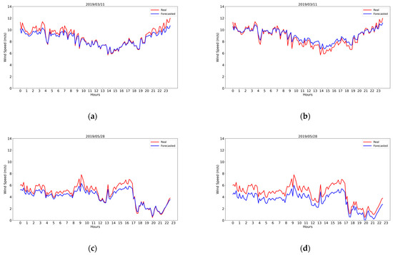 Observing the results obtained for the selected case studies, Table 1 summarizes the values of the different metrics used. Note how, contrary to the average behavior observed previously, in these cases, the forecast generated by the LSTM model that combines SisPI and the observations is worse than that obtained when only the wind measurements were taken into account. However, the results are still good, and the errors were below 1 m/s, except for the results from 28 May 2019. Future research should examine the types of meteorological situation for which SisPI is failing to represent the fields of wind. Regarding the correlation, the behavior was similar with both training sets.