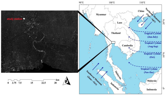 The main air masses influencing Thailand, the direction of SW and NE monsoons, and the study area location (adapted from Laonamsai et al. [3]).