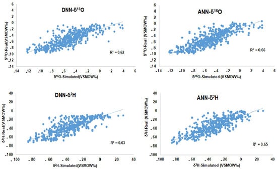 The stable isotope signatures in the precipitation of Bangkok was studied, and the stable isotope content was simulated by a simple ANN model and a more complicated DNN model. To simulate the stable isotopes in the precipitation, the local and regional parameters influencing the stable isotopes content in precipitation were entered into the DNN and ANN models as input data. Comparing the simulated and real isotope data (Figure 2), both DNN and ANN models simulated the stable isotope content with acceptable accuracy. To quantify the accuracy of the simulated stable isotope content, the correlation between the real and simulated stable isotopes was investigated, and the coefficient of determination (R2) was calculated for both models (Figure 3). The results showed that the R2 values for both isotopes (18O and 2H) and for both models were approximately the same ranging from 62% to 66%. These are not very high R2 values, but the accuracy is acceptable for the developed models. To achieve more accurate models, the role of other parameters including cloud top pressure (CTP), cloud top temperature (CTT), and the role of inland/continental moisture sources should also be considered. The CTP and CTT data sets were not available for the entire Bangkok stable isotopes data sets (only for 15 years from 2000 to 2015). However, no comprehensive investigations have been conducted on the role of inland/continental moisture sources on the stable isotope content of the precipitation in Thailand yet. Therefore, these parameters could not be involved in the developed models in this study.