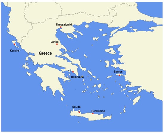 Drought-related data over the period 1990−2020 from seven WMO stations in Greece were used in this work. The meteorological stations from which data were obtained are Hellinikon, Thessaloniki, Kerkira, Samos, Larisa, and Souda and Herakleion (Figure 1). The characteristics of the stations can be seen in Table 1.
