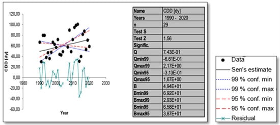 In Figure 2, the statistical results from the application of Sen’s slope and Mann–Kendall method on the yearly time series of the CCD index for the Kerkira station are shown, indicatively. Similar figures were also produced for all indices and stations and for both the seasonal and yearly data.