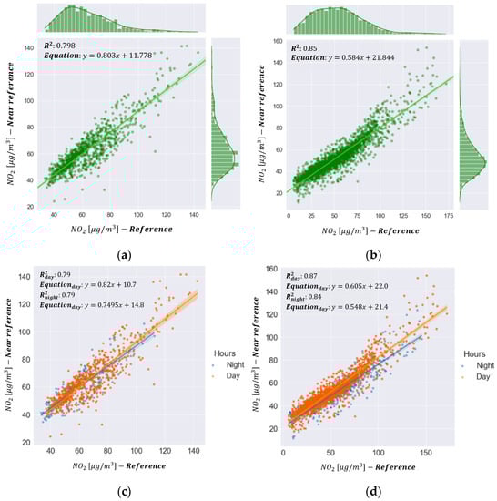 Relationship between near reference and reference monitors’ NO2 measurements in viale Marche. (a) Before calibration; (b) after calibration; (c) day and night concentrations before calibration; (d) day and night concentrations after calibration.