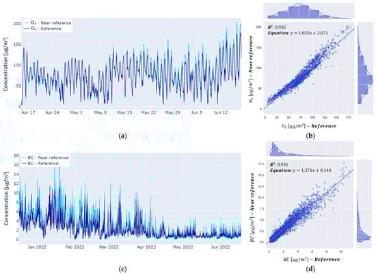 Relationship between near reference and reference monitors’ measurements (a) O3 concentration evolution over time in via Pascal; (b) Linear regression model fitted to the O3 concentrations in via Pascal; (c) BC concentration evolution over time in via Pascal; (d) Linear regression model fitted to the BC concentrations in via Pascal.