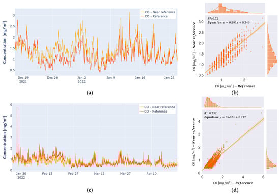 CO underwent a recalibration during the study period of the current analysis. For this reason, two sensor behaviors can be distinguished: before calibration (Figure 3a,b) and after (Figure 3c,d).