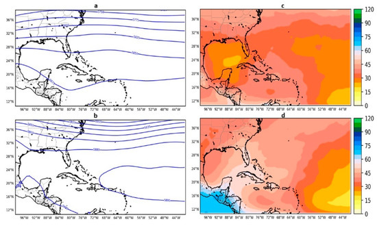 Mean geopotential height maps at the 500 hPa level in May (a) and June (b) with their respective relative humidity maps (c,d) for 2010–2019.