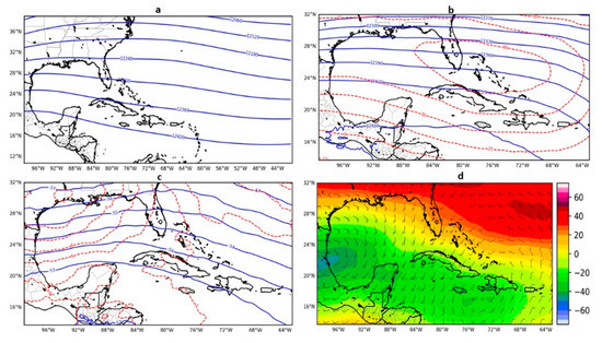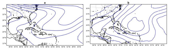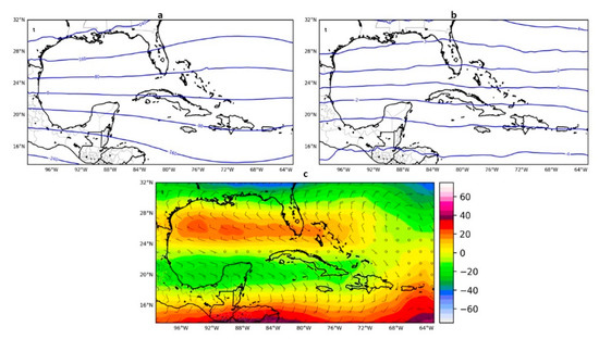 The results obtained by the predecessors to ERA5 suggest that in recent decades the North Atlantic anticyclone has expanded, strengthened and changed locations. These variations seem to be more evident in the middle and lower levels of the troposphere, as well as in the last decade, which is why we first analyzed the height variables geopotential, relative humidity, wind and temperature in the period 2010–2019. Upon obtaining the average maps of ERA5, we were able to appreciate a variety of interesting characteristics. At the 1000 hPa level, it is evident that the mid-position of the subtropical ridge extended to the Gulf of Mexico throughout the 2020 wet season, coinciding with the expansion described in Fernandez et al. (2021) [3].