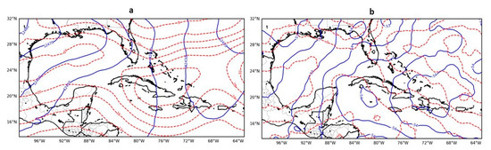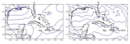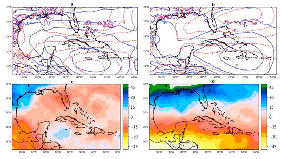 When analyzing the average anomaly maps of the 2020 wet season with respect to the average decade of the ERA5 reanalysis, the greatest changes were observed in the transition months, mainly in May, where positive anomaly values were found in the range between 15 and 60 m2/s2, mainly east of the −88° Meridian, with a maximum located northeast of the southern Bahamas (Figure 3b). The sectors that comprise the Gulf of Mexico and continental America display null variations of the geopotential fields, although their intensity decreases slightly (−15 m2/s2) over central portions of Mexico. This could be associated with a strengthening of high geopotential values due to an expansion of the subtropical ridge at high levels, which corresponds to the temperature anomalies obtained, around 1 °C (Figure 3c), generated by heating due to diabatic compression associated with the anticyclone that heats air layers in the atmosphere. The analysis of the anomalies in the wind field (Figure 3d) revealed that the speed of the wind increases, with values between 20 and 50 km/h north of the 24° Parallel, coinciding with the region of greater warming, which suggests a certain direct relationship between the behavior of both variables. This behavior could lead to a southward extension of the subtropical jet stream, which may, in turn, lead to more baroclinic environments in the tropical zone. Although the average position of the May–June through led to a decrease in rainy days, especially towards the west, these baroclinic environments could generate favorable conditions for local instability to lead to severe weather manifestations. This fact, although not proven by studies, has been observed and documented in recent years by specialists and amateurs.
