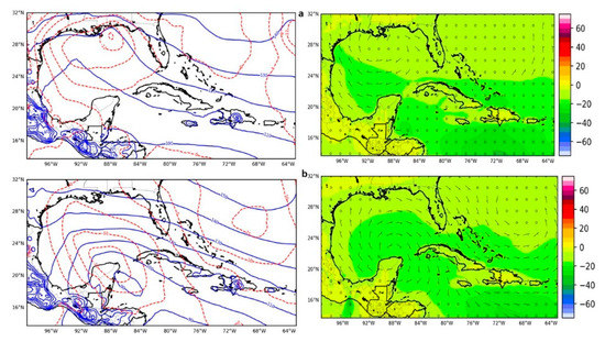 At 1000 hPa, a southern relocation of the regions of high geopotential value was observed for May, specifically over the Caribbean Sea. Average flow predicted by SisPI differs from the original pattern, which places the areas of high geopotential values at the north of the Greater Antilles, imposing an almost zonal flow, while SisPI represent a southeast flow over Cuba. Despite this, the geopotential errors at this level are in the −60 to 60 m2/s2 order (Figure 10a).