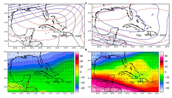 In addition, an anomalous anticyclonic circulation centered on the mean wind map stands out approximately over Hispaniola, (see Figure 3d) which may be in response to the expansion of the subtropical ridge and the consequent formation of secondary anticyclonic circulations in the region of the periphery of the same. Portions where negative anomalies are observed in the geopotential fields coincide with a cooling in high levels and a decrease in winds.
