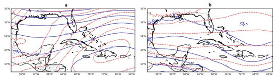 At middle levels of the troposphere at the beginning of the study period, it was observed that the axis of the May–June seasonal trough was moving further east, causing an area of maximum vorticity advection of the trough to be found in the central and eastern regions of the territory, while the driest portion was located in the west. These changes in geopotential fields were also reflected in the relative humidity fields at this level. In May, the driest values on the island were over the west of the country, and the wettest extended along the central and eastern regions, coinciding with the zone of maximum vorticity advection cyclone of the trough. These results indicated that the beginning of the wet season was delayed in Cuba’s western region (Figure 1). Continuing with the middle levels analysis in summer, similar to what was obtained by Fernández et al. (2021), a belt of high geopotential values close to the Tropic of Cancer was observed, suggesting an interaction between the Mexican and the subtropical ridge. This fact could be the cause of limited exchange between tropic and mid latitudes.