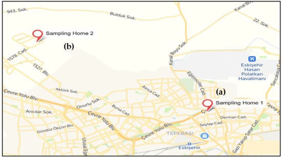 In this study, indoor and outdoor NO2 and O3 concentrations were determined in two selected homes in Eskisehir, Turkey. Some parameters such as the number of people living and working at the homes, the size and locations of the homes, and the number of the rooms were considered when choosing homes. Twenty-four-hour sampling was carried out in the living room, bedroom, kitchen, bathroom, and corridor in each home. The Google Earth view of the homes included in the study is shown in Figure 1.