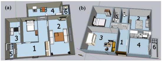 Floor plan and indoor–outdoor sampling points in: (a) home 1; (b) home 2. 1: Corridor, 2: Living Room, 3: Bedroom, 4: Kitchen, 5: Bathroom, 6: Outdoor.