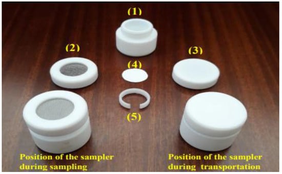 The passive samplers used in the study were developed and validated by Eskisehir Technical University Environmental Engineering Department Air Quality Research Group [,,,,]. The main parts of the passive sampler are: (1) sampler body, (2) stainless steel mesh barrier, (3) closed cap, (4) filter paper impregnated with specific solution, and (5) fixer ring. The passive sampler body was manufactured from polytetrafluoroethylene (PTFE) for NO2 and delrin for O3. As a collecting medium, Whatman GF/A glass fiber filter papers impregnated with 20% Triethanolamine (TEA) aqueous solution for NO2, and aqueous solution containing 1% NaNO2, 2% Na2CO3, and 2% glycerol for O3, were used. Figure 3 shows an example of the NO2 passive sampler and its parts [].