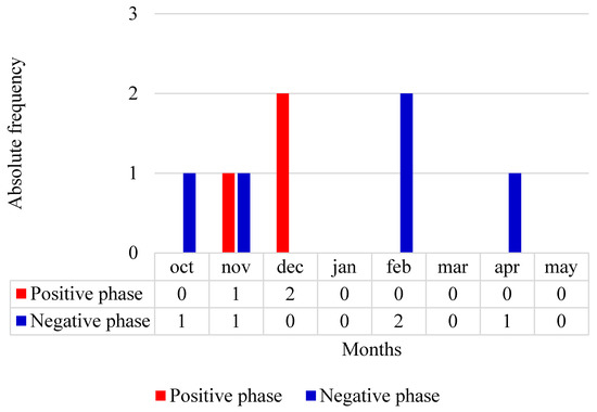 Of these, three months corresponded to the positive phase, representing 9.1% of the total number of months, while five months corresponded to the negative phase, which was more representative than the positive phase, representing 15.2%. The remaining 25 months corresponded to the neutral phase of this oscillation. Figure 1 shows the monthly absolute frequency of each of the phases of this oscillation in the study sample. The positive phase of this event was more frequent in the month of December, with two cases, and in the month of November, with only one case, while in the rest of the months it was in its neutral phase. The negative phase of this oscillation was most represented in the month of February, with two episodes, while in the months of December, January, March, and May the frequency was zero, and in the remaining months there was only one case.