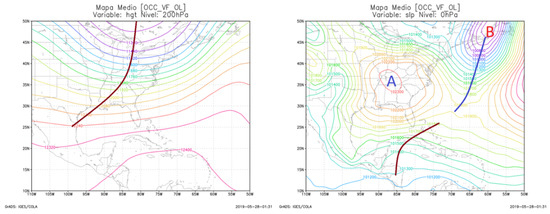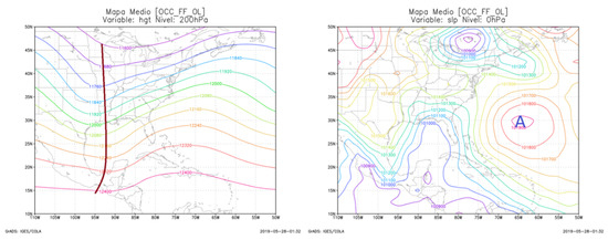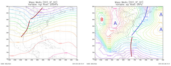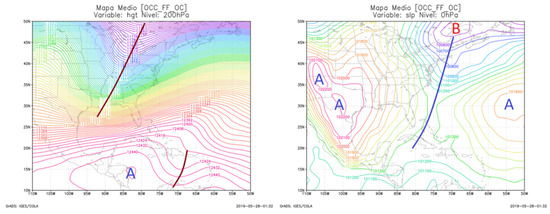 Long-wave trough pattern associated with frontal surface trough. Left panel shows the variable at 200 hPa and the right one at 0 hPa. The graphs were created by the authors in the software GrADS.