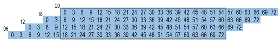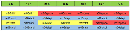 A schematic representation is shown in Figure 1, where four daily runs with initialization 0000, 0600, 1200 and 1800 UTC can be viewed, with the 0000 UTC run being the most updated. If m00, m06, m12 and m18 are denoted as the members of a set defined by the runs of 0000, 0600, 1200 and 1800 UTC, respectively, then given the scheme, for the first 54 h of forecast of m00, it is also counted with the forecast of the 60, 66 and 72 h of the members m18, m12 and m06, that is, the set is made up of four members for that range of hours.