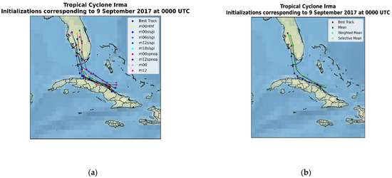 Tropical Cyclone Irma: initializations corresponding to 9 September 2017 at 0000 UTC. (a) Employed members; (b) obtained ensembles.