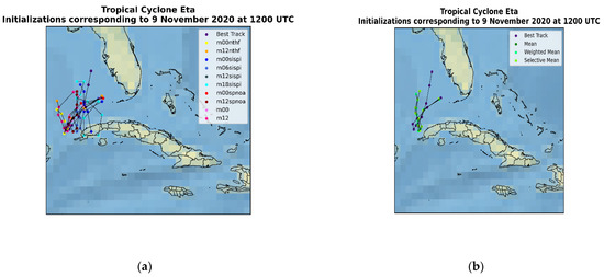 Tropical Cyclone Irma: initializations corresponding to 9 November 2020 at 1200 UTC. (a) Employed members; (b) obtained ensembles.