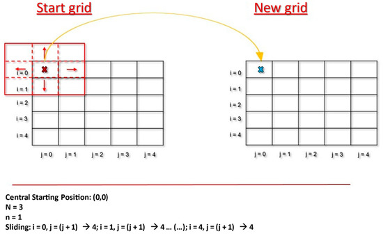 The sliding window technique uses a window of moving space on a grid to select the data for processing. The window moves incrementally forward in space (Figure 1), generating a complete solution each time. In the case of this investigation, each complete solution is exported to a new mesh created with the solutions obtained by this method. Next, with the elements of the window, the mean, the median, and the maximum are calculated. The fundamental parameters of the method are explained below: