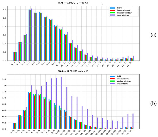 BIAS values of the first case study for the initialization of 12:00 UTC. (a) For window width N = 3. (b) For window width N = 15.