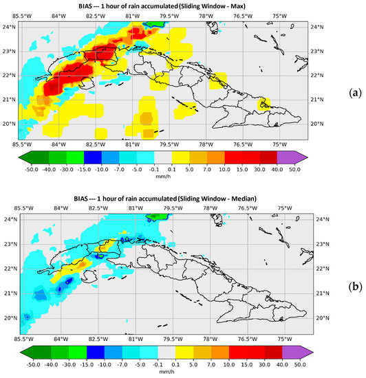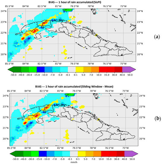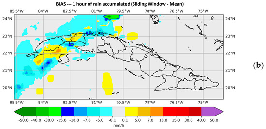 Figure 4 shows the plotted values of the BIAS. In Figure 4a the SisPI is shown once the method has been applied with the maximum instruction and in Figure 4b with the median instruction for the same forecast term (both for a window width N = 3). It can be observed that the maximum instruction overestimates the amount of precipitation, showing errors of even 30 mm of precipitation in 1 hour. Figure 4b shows how using the method with the window width N = 3 and the medium instruction, the magnitude with which the instruction decreases the precipitation amount errors is quite small, as was the case with the mean instruction (Figure 3b).